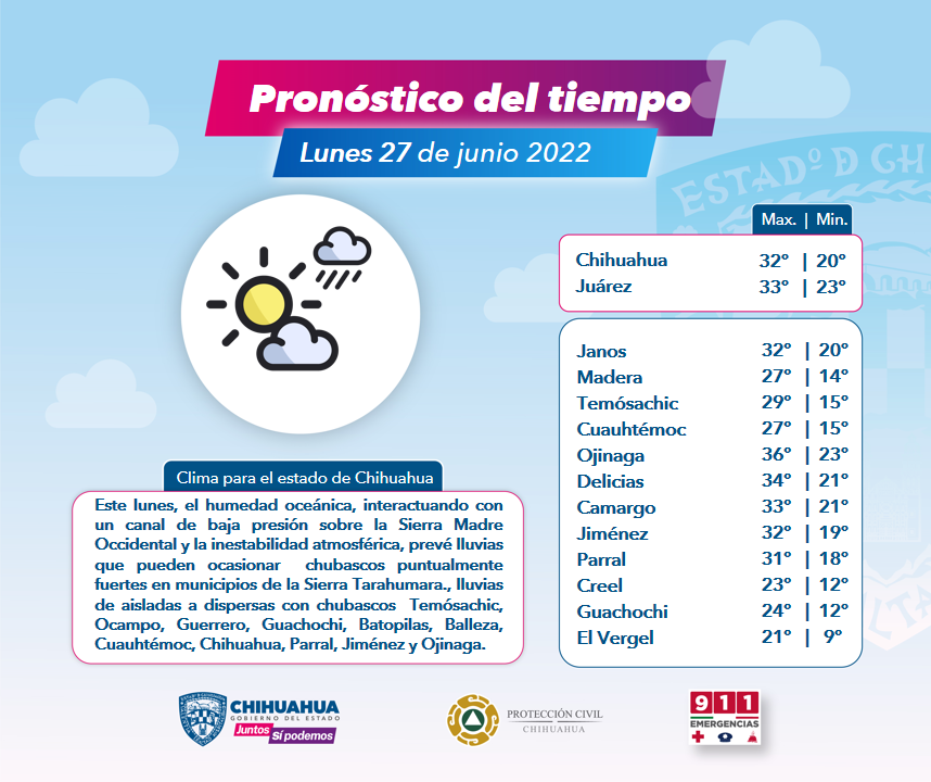 Las temperaturas máximas esperadas para esta tarde de lunes 27 (°C): Chihuahua 31, Juárez 33, Janos 32, Madera 26, Temósachic 28, Cuauhtémoc 26, Ojinaga 35, Delicias 34, Camargo 33, Jiménez 32, Parral 30, Chínipas 36, Creel 23, Guachochi 23 y El Vergel 21.