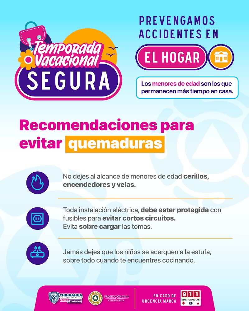 En esta temporada de vacaciones de verano, la Coordinación Estatal de Protección Civil (CEPC) se enfoca en la prevención de accidentes en casa durante este periodo, para que las familias chihuahuenses puedan disfrutar de un tiempo seguro y placentero en sus hogares.