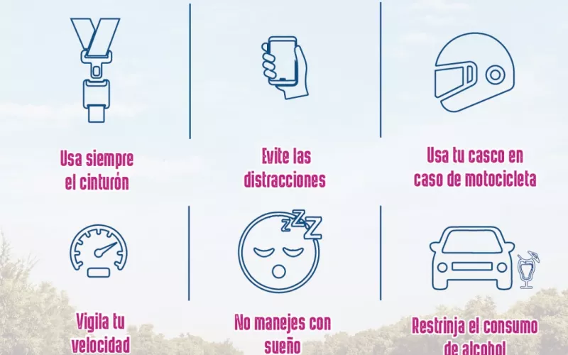 Seguir las normas de la Ley de Vialidad y respetar los límites de velocidad, evitar el uso del teléfono móvil mientras se conduce y mantener la atención en la carretera, nunca conducir bajo la influencia de alcohol o drogas (designar un conductor designado si es necesario), informar a familiares o conocidos el itinerario y hora estimada de llegada, especialmente en viajes largos.