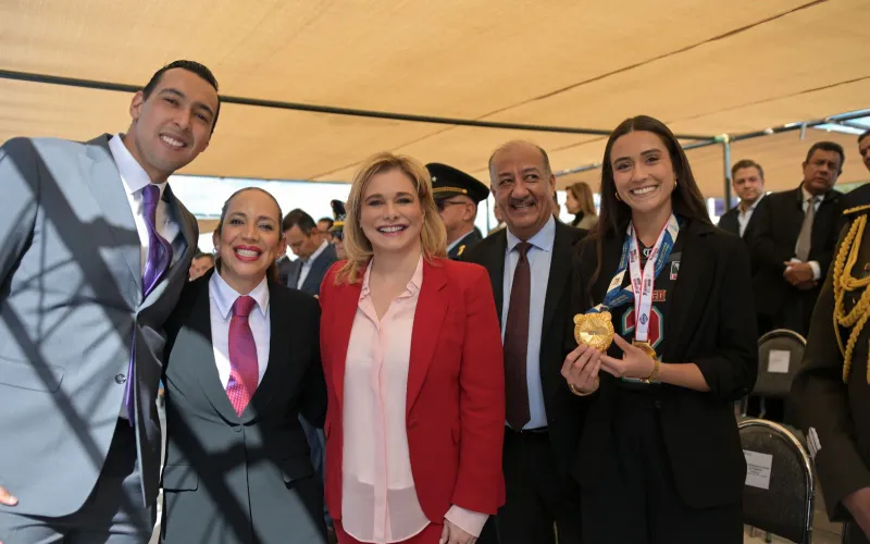 Durante el evento, la titular del Ejecutivo se tomó la foto del recuerdo con la propia Alegna y el resto de los ganadores del PED 2025, Kenia Contreras, Uziel Muñoz y Juan de Dios Vázquez, y con la bicampeona mundial de Tochito, Victoria Chávez, quien fue nominada a dicho galardón.