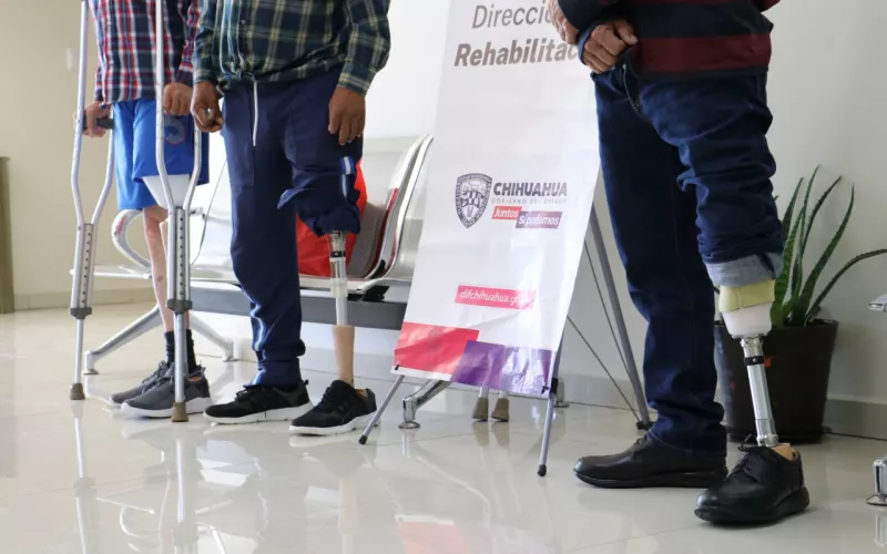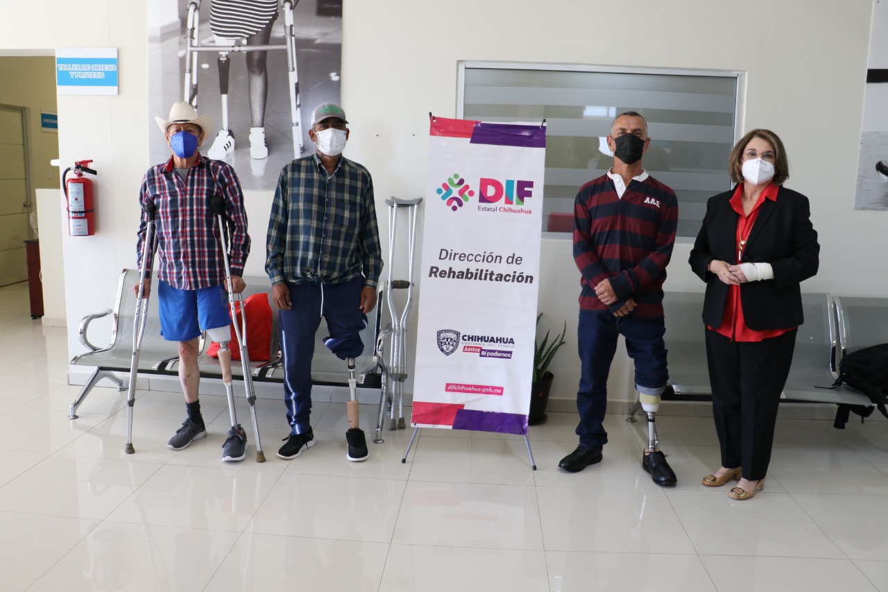 La presidenta del DIF Estatal, María Eugenia Galván Antillón, acompañada del director de Rehabilitación, Hiram Mendoza Rodríguez, hizo entrega de tres prótesis de miembros inferiores a beneficiarios procedentes del municipio de Cuauhtémoc.