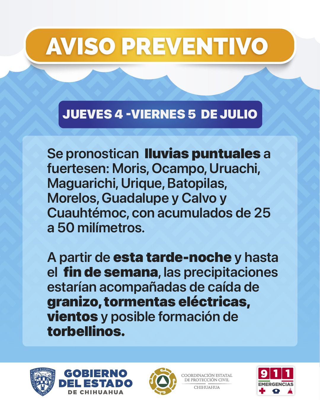 También se esperan lluvias de dispersas a moderadas con chubascos en Madera, Gómez Farías, Temósachic, Matachí, Namiquipa, Bachíniva, Guerrero, Bocoyna, Carichí, Chínipas, Guazapares, Guachochi, Balleza, San Francisco de Borja, Cusihuiriachi, Riva Palacio, Gran Morelos, Santa Isabel, Belisario Domínguez, Chihuahua, Allende y Ojinaga.