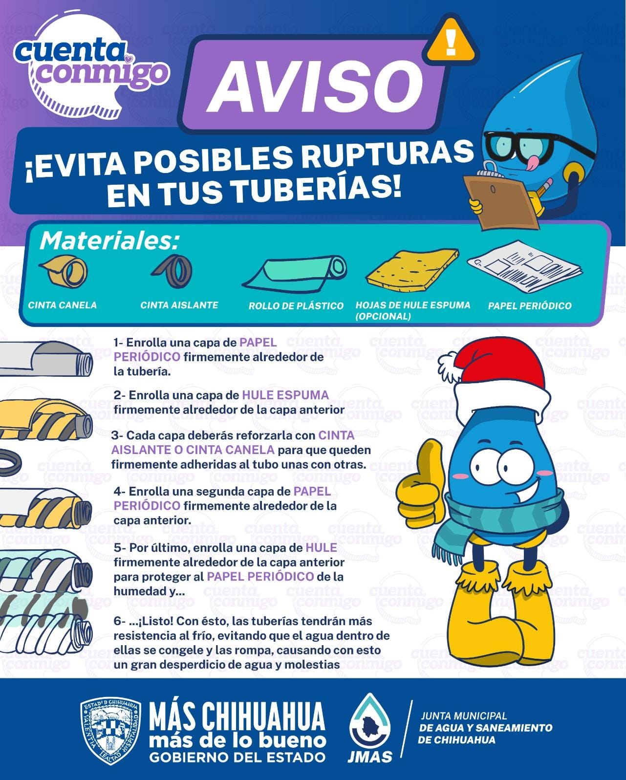 Ante las bajas temperaturas previstas durante la presente temporada invernal, la Junta Municipal de Agua y Saneamiento (JMAS) de Chihuahua exhortó a la población a proteger las tuberías externas de sus domicilios, para evitar posibles rupturas.