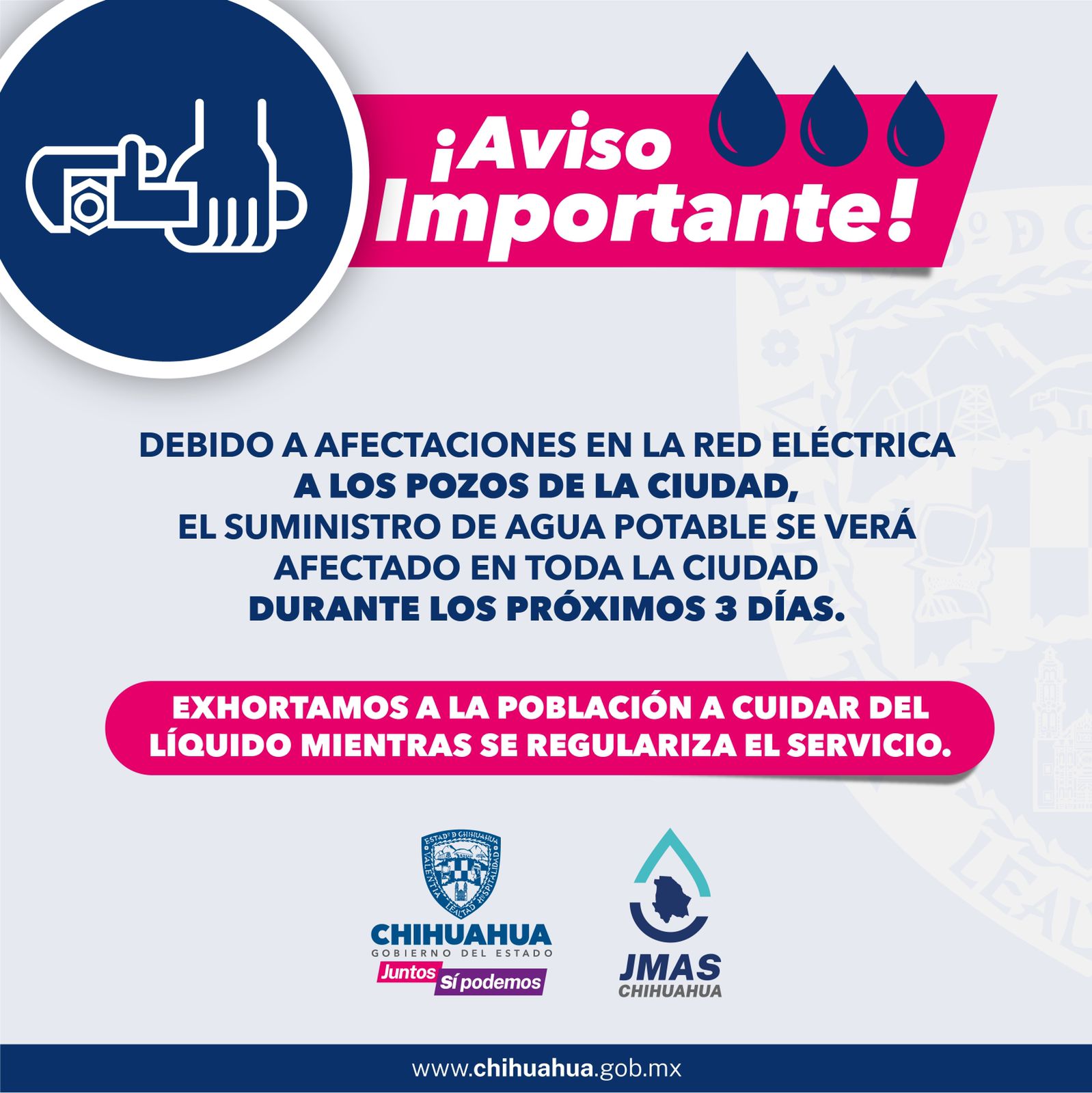 Diversas fallas de suministro de energía eléctrica por parte de la Comisión Federal de Electricidad (CFE) han generado interrupciones en el servicio de energía de la mayoría de los pozos que suministran agua potable a la ciudad, por lo que la JMAS Chihuahua exhorta a tomar precauciones ante la falta del vital líquido o baja de presión para los próximos 3 días.