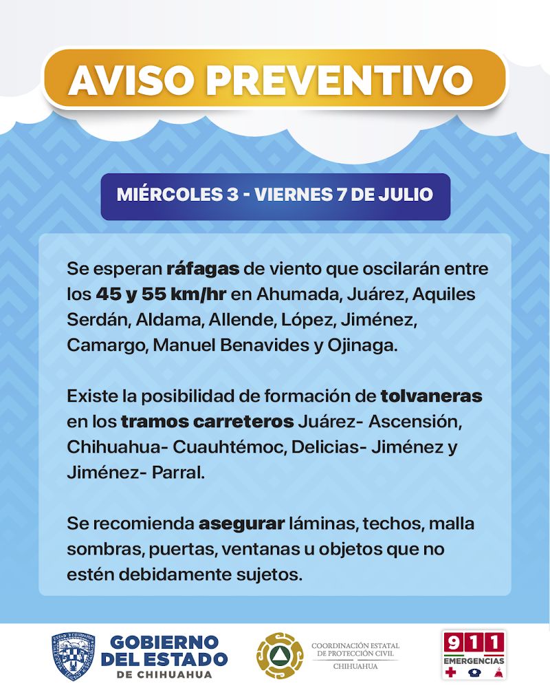La CEPC refiere que, para los días miércoles 3, jueves 4 y viernes 5, las rachas podrían superar los 45 y 55 kilómetros por hora (km/h) en Ahumada, Juárez, Aquiles Serdán, Aldama, Allende, López, Jiménez, Camargo, Manuel Benavides y Ojinaga.