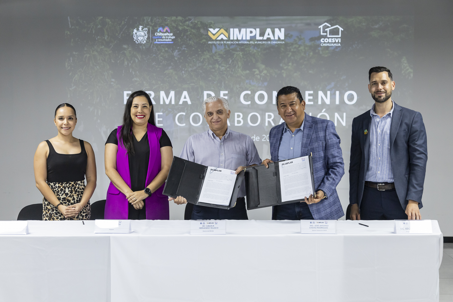 Directivos de la Comisión Estatal de Vivienda, Suelo e Infraestructura, COESVI, firmaron un convenio de colaboración con el Instituto de Planeación Integral del Municipio de Chihuahua (IMPLAN), para trabajar de manera coordinada en mejorar y dignificar la vida de las familias por medio de un crecimiento integral en el tema de vivienda.