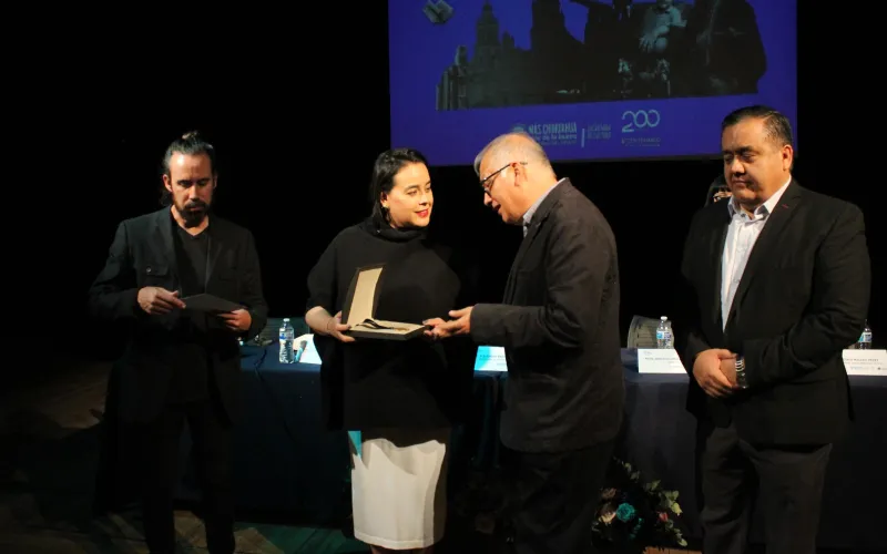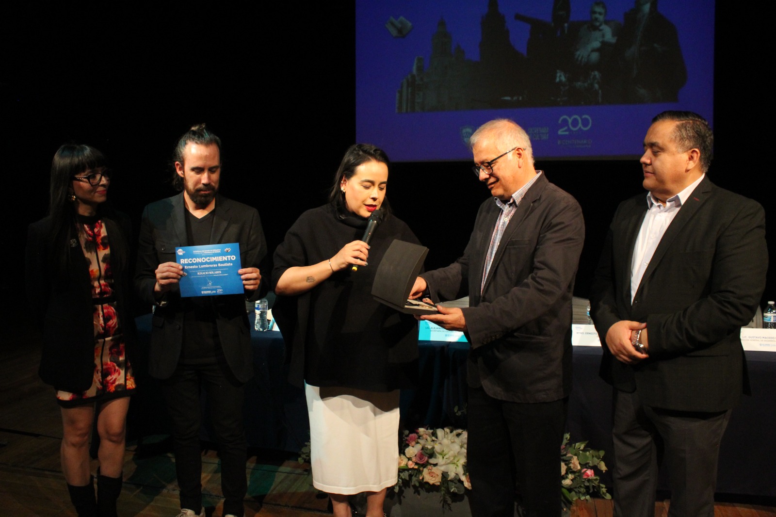 En ceremonia efectuada en el Teatro Experimental “Octavio Trías”, en el Centro Cultural Paso del Norte, el literato recibió la presea de manos de la secretaria de Cultura, Alejandra Enríquez Gutiérrez.