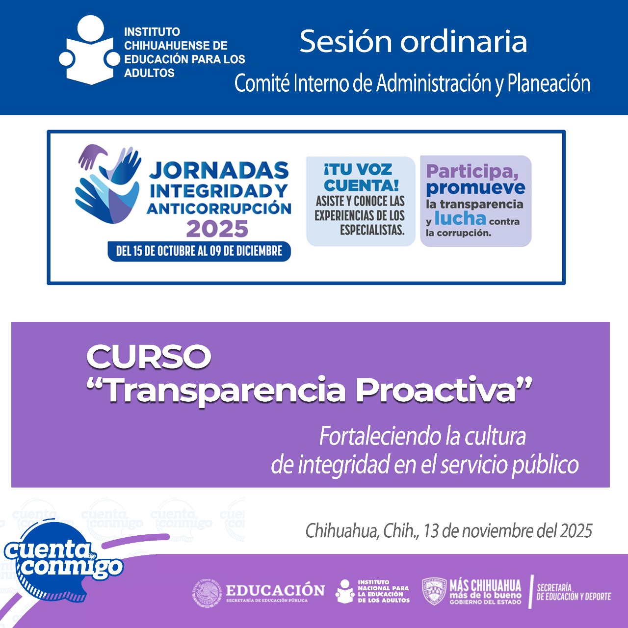 La Secretaría de la Función Pública (SFP) llevó a cabo el curso “Transparencia Proactiva” en el Salón Miguel Hidalgo de Palacio de Gobierno, dirigido a servidores públicos del Instituto Chihuahuense de Educación para los Adultos (ICHEA), con el propósito de fortalecer una gestión más abierta y cercana a la ciudadanía.