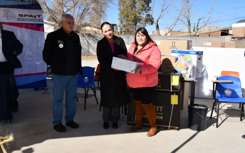 La obra incluye dos aulas, servicios sanitarios, explanada, mobiliario y cerco perimetral de 300 metros, además de un aula móvil doble que fue facilitada por Servicios Educativos del Estado de Chihuahua (SEECH).