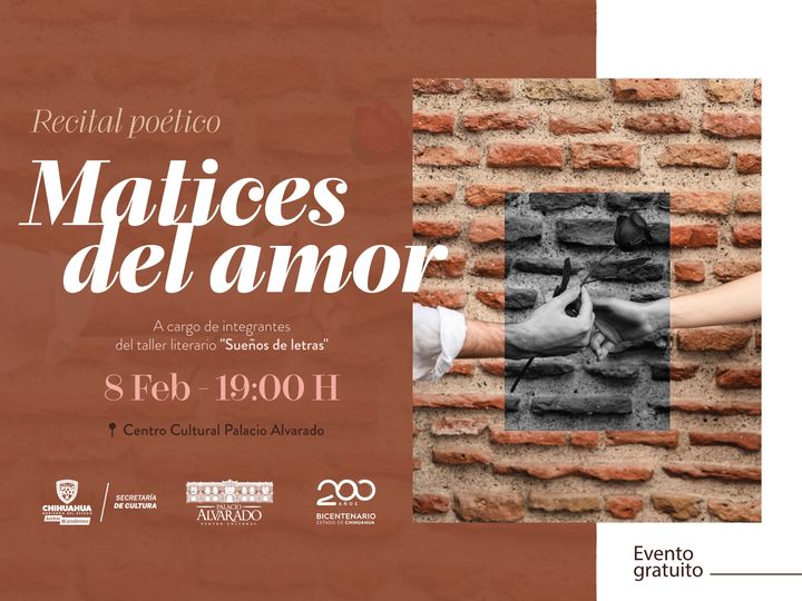 Con el objetivo de impulsar el talento estatal y fomentar la escritura y la lectura, la Secretaría de Cultura invita al recital “Matices del Amor”, que se realizará el jueves 8 de febrero a las 19:00 horas en el Centro Cultural Palacio Alvarado, con la participación de nueve poetas parralenses pertenecientes de la Sala de Lectura “Leyendo y Reconstruyendo”; entrada libre.
