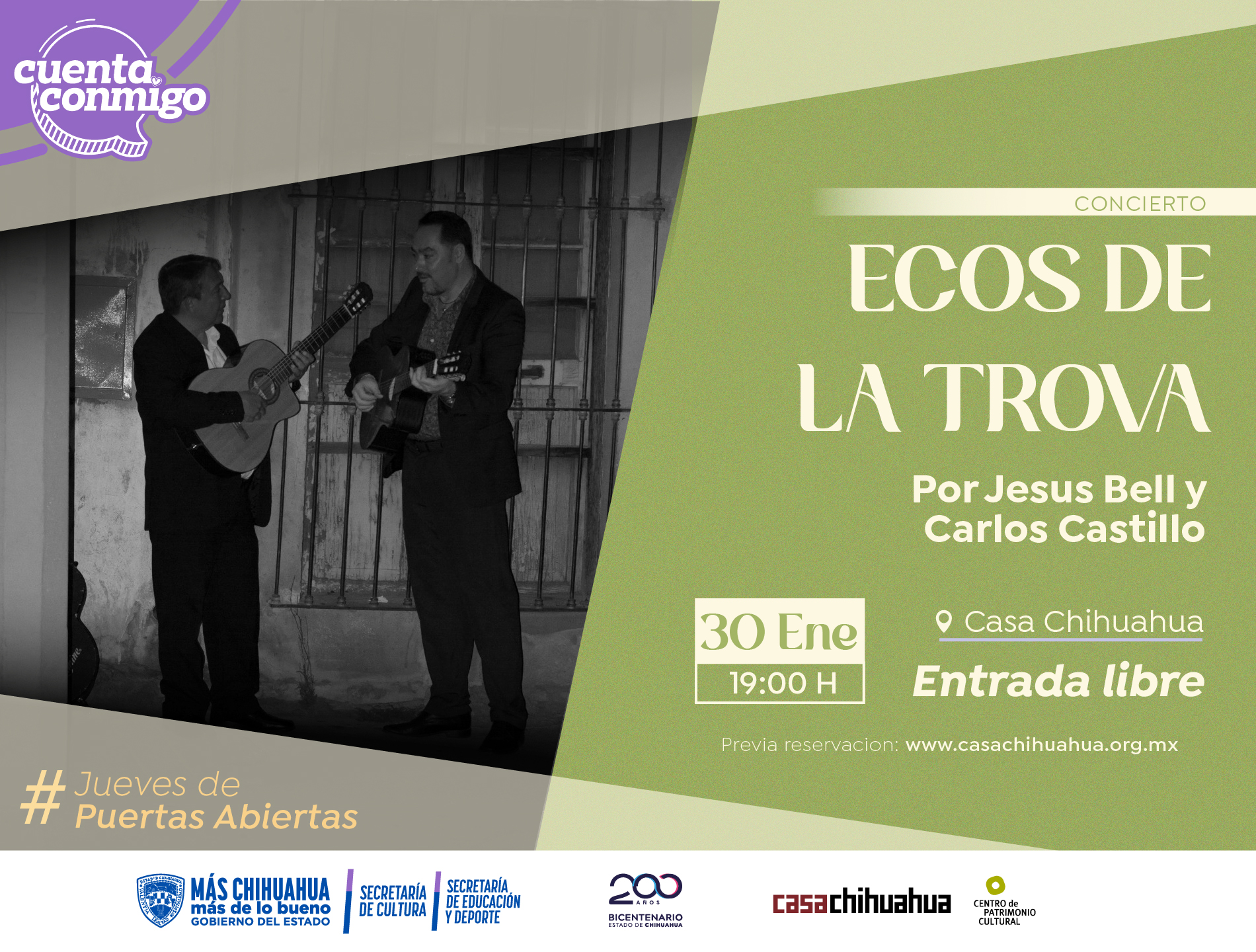Casa Chihuahua Centro de Patrimonio Cultural anuncia el concierto titulado “Ecos de la Trova”, que se llevará a cabo el próximo jueves 30 de enero, como parte de su ya tradicional programa jueves de Puertas Abiertas.