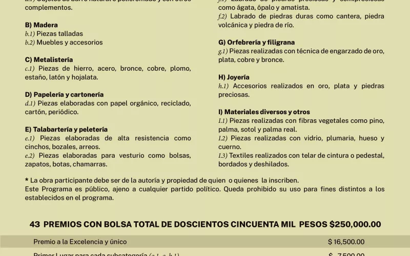 La bolsa total es de 250 mil pesos que se repartirán en 43 premios a los trabajos más destacados en 9 diferentes categorías como; alfarería y cerámica, madera, metalistería, papelería y cartonería, talabartería y peletería, lapidaria y cantería, orfebrería y filigrana, joyería, así como metales diversos y otros. El objetivo de este concurso es incentivar, reconocer y premiar la labor y el talento de las personas artesanas más destacadas de la región noroeste del Estado de Chihuahua.