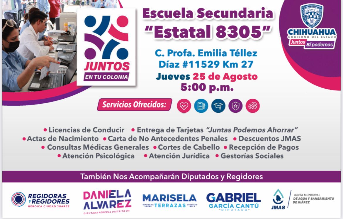 Como parte de las acciones que realiza Gobierno del Estado a favor de los juarenses, este jueves 25 de agosto los habitantes de la colonia Kilómetro 27 podrán aprovechar los servicios del programa “Juntos en tu colonia” que se ofrecerán en la Escuela Secundaria Estatal 8305, ubicada en la calle Emilia Téllez Díaz #11529, a partir de las 5 de la tarde hasta las 8 de la noche.