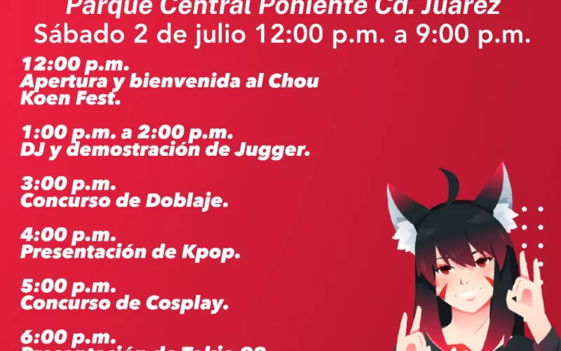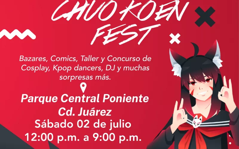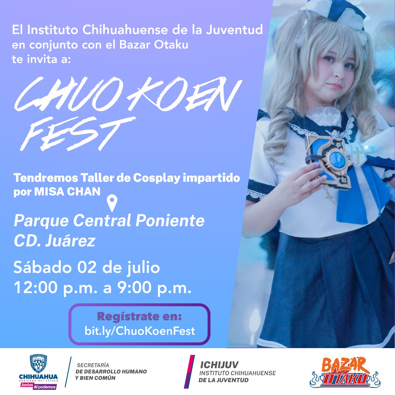 Con la finalidad de brindar apoyo a jóvenes y a diferentes grupos culturales de Ciudad Juárez, el Instituto Chihuahuense de la Juventud Zona Norte (ICHIJUV), en conjunto con Bazar Otaku, realizará el evento “Chuo Koen Fest” para impulsar la cultura asiática y el anime.