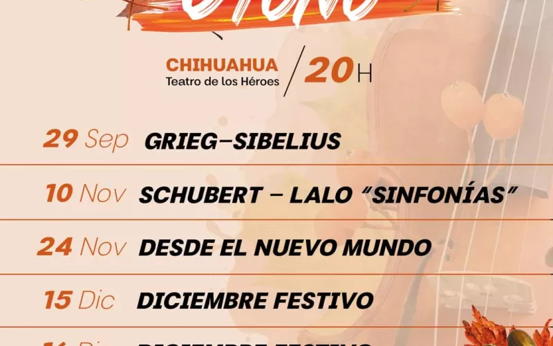 La Secretaría de Cultura invita a la ciudadanía a disfrutar de la programación que la Orquesta Filarmónica del Estado de Chihuahua (OFECh), ofrece como parte de la Temporada de Otoño 2023, que se desarrollará del 29 de septiembre al 16 de diciembre en las ciudades de Chihuahua y Cuauhtémoc.