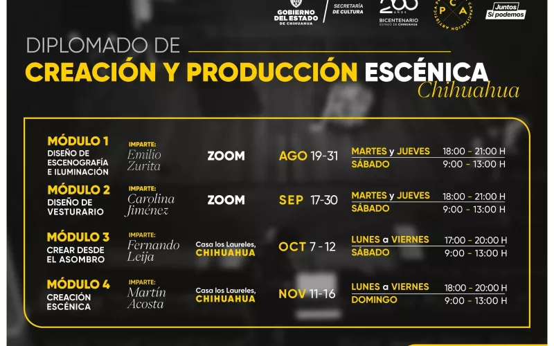 Con el objetivo de fortalecer y crear espacios de intercambio en la comunidad artística, la Secretaría de Cultura, a través del Programa de Capacitación Artística (PCA), invita a sumarse al Diplomado de Creación y Producción Escénica en Chihuahua.