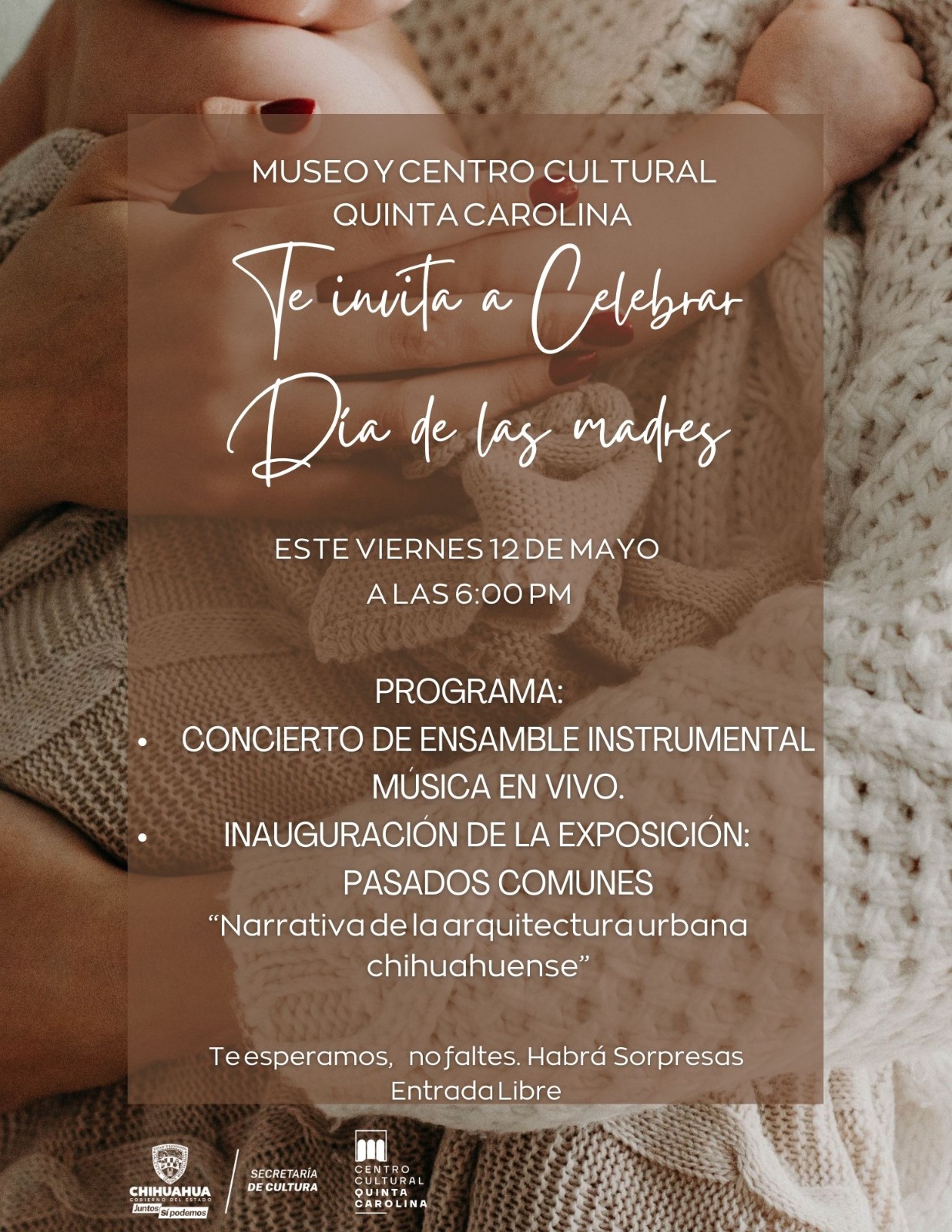 La Secretaría de Cultura de Chihuahua invita a celebrar el Día de las Madres en el Museo y Centro Cultural “Quinta Carolina”, este viernes 12 de mayo a partir de las 18:00 horas, con la presentación de música en vivo y la inauguración de la exposición fotográfica “Pasados comunes, narrativa de la arquitectura urbana chihuahuense”.