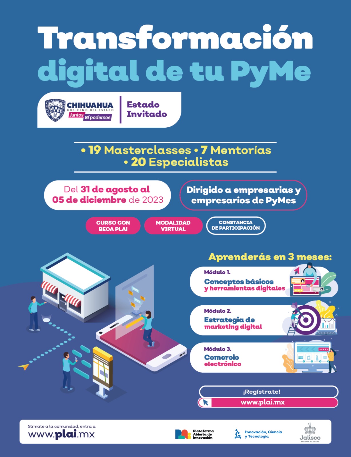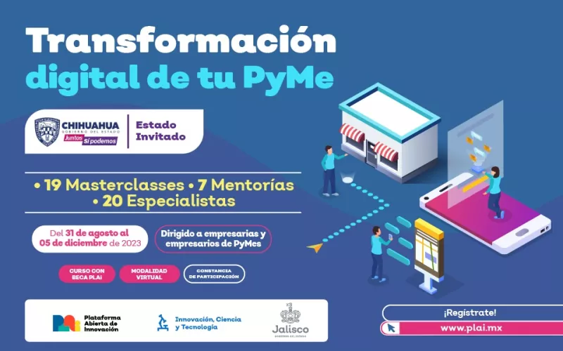 La Secretaría de Innovación y Desarrollo Económico (SIDE), a través del Instituto de Innovación y Competitividad (I2C), junto al Gobierno del Estado de Jalisco, invitan al curso “Transformación digital de tu Pyme”, por la Plataforma Abierta de Innovación y Desarrollo (PLAi).