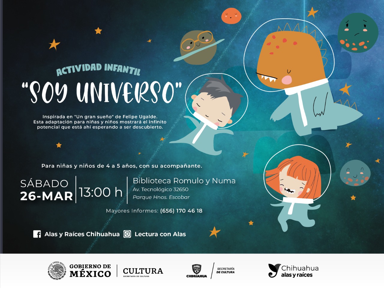 La Secretaría de Cultura, a través del programa “Alas y Raíces” invita a niñas y niños de hasta 5 años, a participar en la actividad “Soy Universo” a realizarse en la Biblioteca Rómulo y Numa, el sábado 26 de marzo a las 13:00 horas.