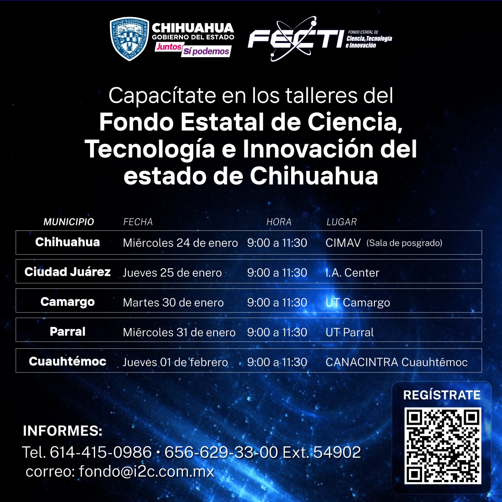 Con el objetivo de proporcionar información detallada sobre las reglas de operación y los proyectos elegibles, en las convocatorias vigentes del Fondo Estatal de Ciencia Tecnología e Innovación (FECTI), el Instituto de Innovación y Competitividad (I2C) invita a los talleres que se impartirán en Chihuahua, Juárez, Camargo, Delicias, Parral y Cuauhtémoc.