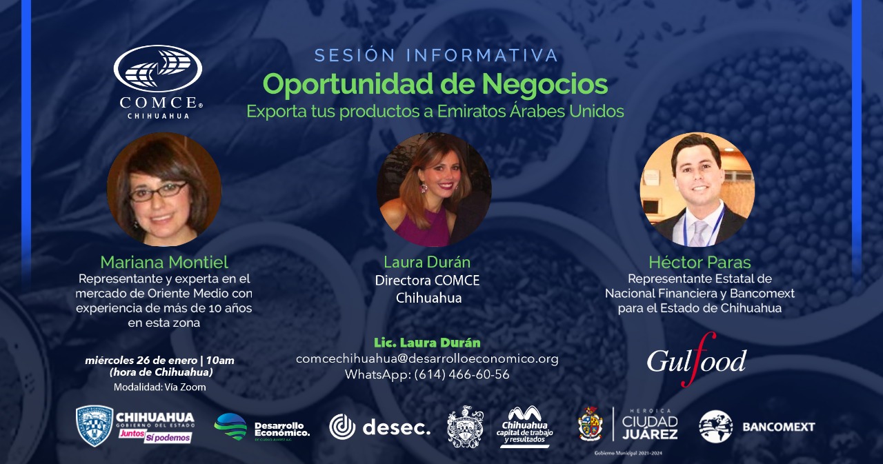 Mariana Montiel, representante y especialista en el mercado de Oriente Medio, con 10 años de experiencia en la región; Héctor Paras, representante Estatal de Nacional Financiera y Bancomext para el Estado de Chihuahua; Laura Durán, directora del Consejo Empresarial Mexicano de Comercio Exterior, Inversión y Tecnología, A.C. (COMCE) Chihuahua; y Jesús García, director de Comercio de la SIDE serán los encargados de guiar la plática.
