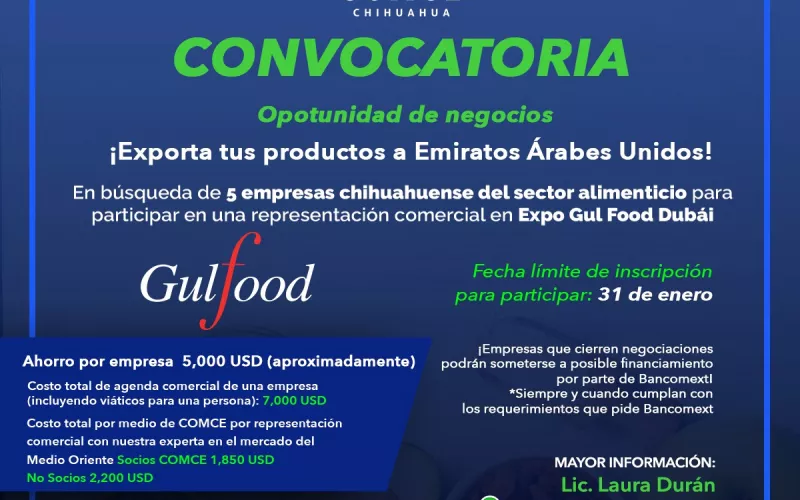 Para impulsar la exportación de productos chihuahuenses hacia los Emiratos Árabes, Gobierno del Estado, a través de la Secretaría de Innovación y Desarrollo Económico (SIDE), y de manera conjunta con el Consejo Mexicano de Comercio Exterior Chihuahua, promueve la participación de productoras y productores estatales de los sectores de alimentos y/o bebidas, en la Expo GulFood Dubái 2022.