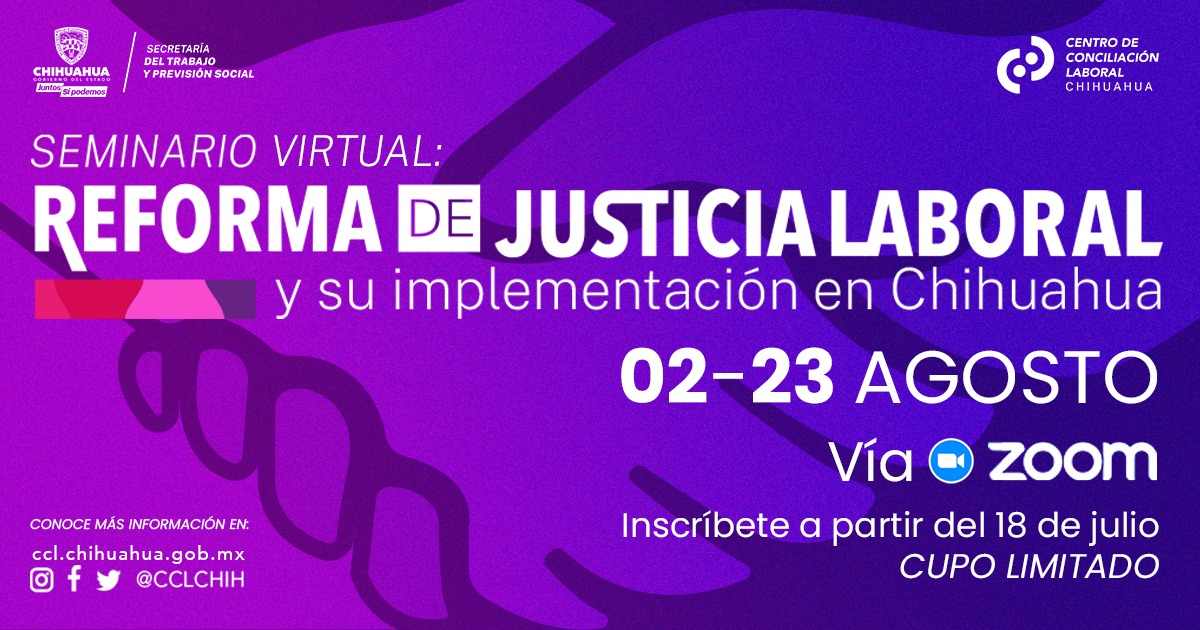 Con el objetivo de sensibilizar a la ciudadanía sobre la entrada en vigor de la Reforma Laboral en la entidad, el Centro de Conciliación Laboral del Estado de Chihuahua (CCL) invita a participar en el seminario virtual “Reforma de Justicia Laboral y su implementación en Chihuahua” del 2 al 23 de agosto.