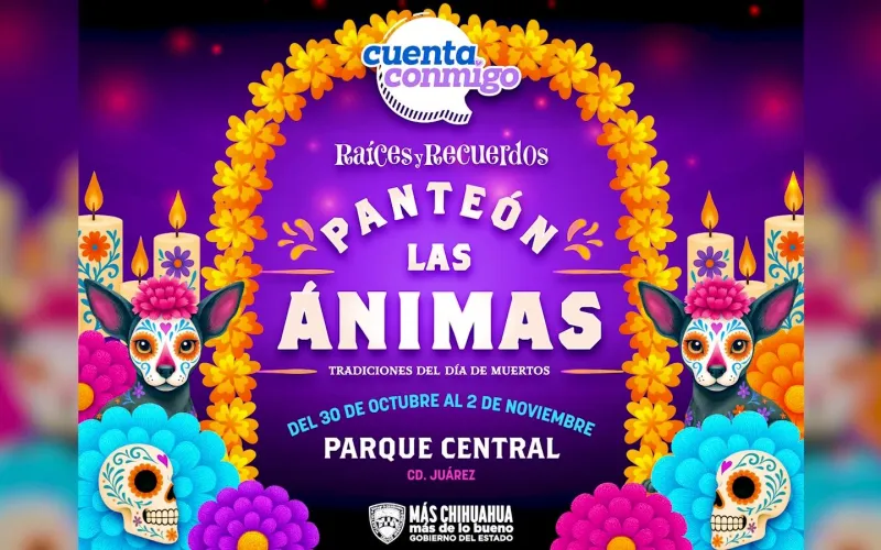 El Gobierno del Estado, a través de la Secretaría de Hacienda, reitera su invitación para que, del 30 de octubre al 2 de noviembre, las y los juarenses disfruten de la celebración del Día de Muertos con el evento de altares “Raíces y Recuerdos: Panteón las Ánimas”, que se llevará a cabo en el Parque Central Poniente de Ciudad Juárez.