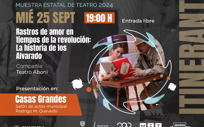 En Casas Grandes la Compañía de teatro “Aboni”, originaria de Parral, presentará la obra “Rastros de amor en tiempos de la revolución: la historia de los Alvarado”, en el Salón de Actos Municipal “Rodrigo M. Quevedo”, el miércoles 25 de septiembre a las 19:00 horas.