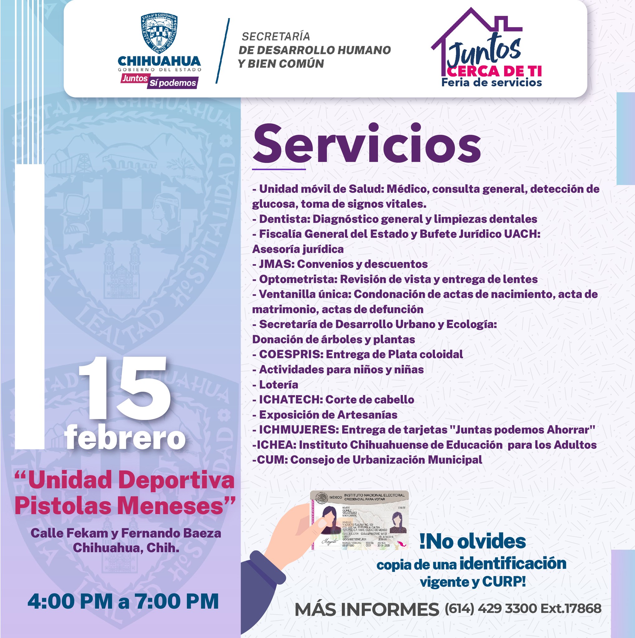 La Secretaría de Desarrollo Humano y Bien Común (SDHyBC), a través de la Dirección de Cohesión Social y Participación Ciudadana, llevará este jueves 15 de febrero la feria de servicios “Juntos Cerca de Ti” a las instalaciones de la Unidad Deportiva José “Pistolas” Meneses, en el norte de la capital del estado.
