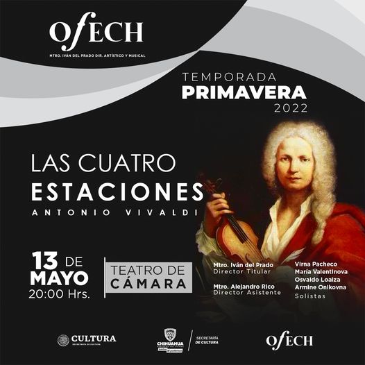 La Secretaría de Cultura invita al sexto concierto de la Temporada de Primavera 2022 de la Orquesta Filarmónica del Estado de Chihuahua (OFECH), que ofrecerá a los asistentes la ejecución de las piezas que conforman las cuatro estaciones del compositor y violinista italiano, Antonio Vivaldi.