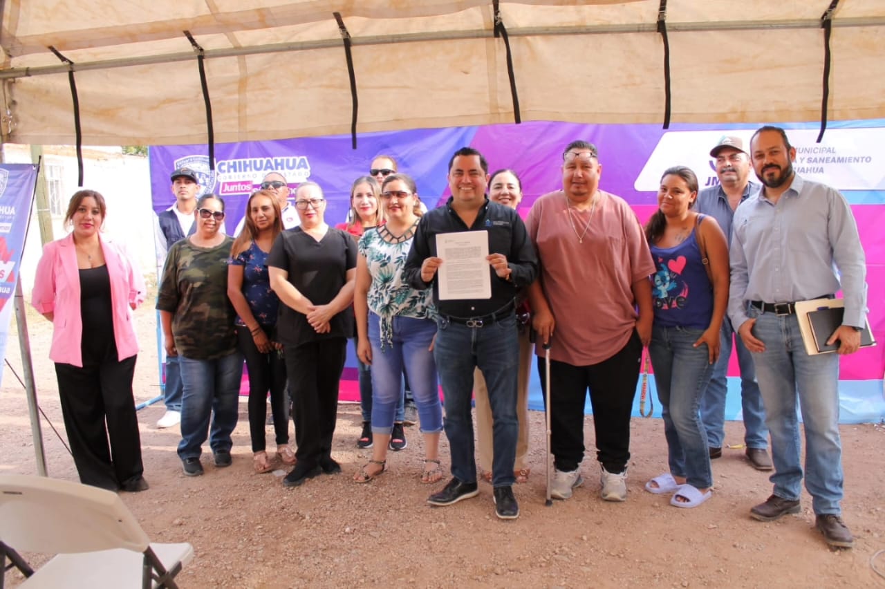 El director ejecutivo de la Junta Municipal de Agua y Saneamiento (JMAS) de Chihuahua, Alan Falomir Sáenz, encabezó la firma de convenio entre el organismo y los vecinos de la calle privada Brigada de Morelos, en la colonia Plan de Ayala ubicada al sur de la ciudad, para la introducción del servicio de agua potable y alcantarillado sanitario.
