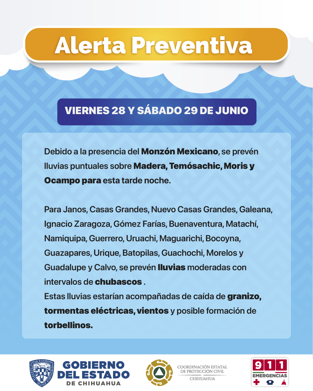 La Coordinación Estatal de Protección Civil (CEPC), mantiene la alerta preventiva ante el pronóstico de lluvias moderadas a puntualmente fuertes para esta tarde en Madera, Temósachic, Moris y Ocampo.