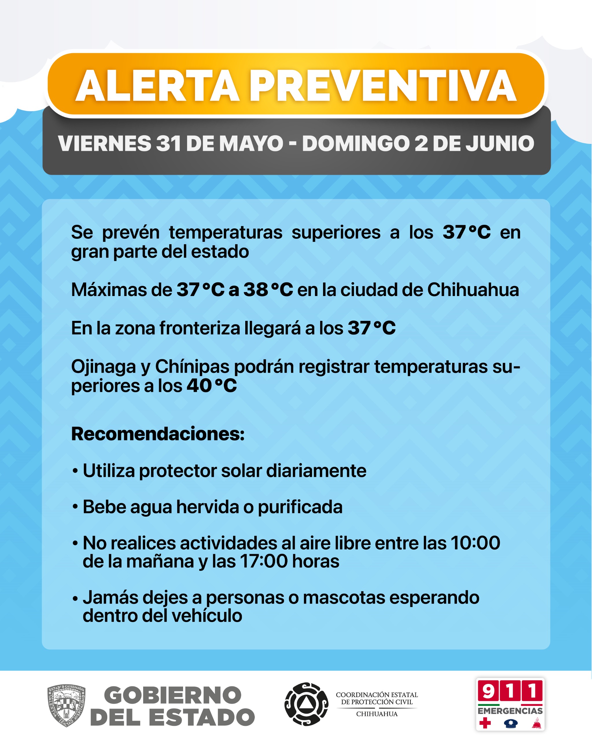 Temperaturas máximas y mínimas para el sábado 1 de junio (°C): Chihuahua 38/20, Juárez 37/22, Janos 36/16, Madera 29/9, Temósachic 31/7, Cuauhtémoc 33/15, Ojinaga 41/25, Delicias 39/20, Camargo 39/20, Jiménez 38/19, Parral 36/19, Creel 28/6, Chínipas 41/23, Guachochi 28/6 y El Vergel 27/5.