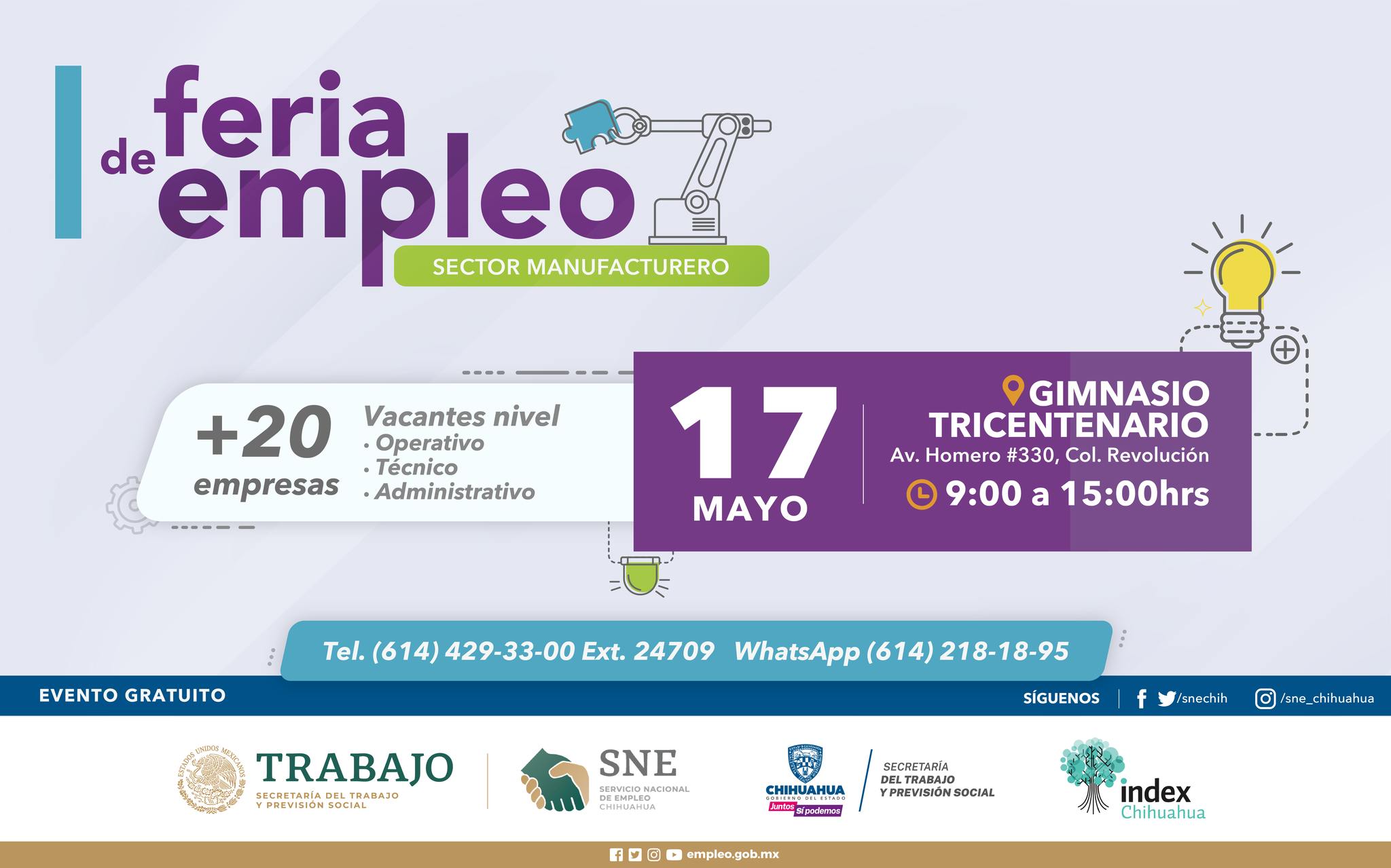 La Feria de Empleo del Sector Manufacturero es un evento gratuito. Para mayor información, se pone a disposición de la población la línea telefónica (614) 4293300 extensión 24709 y vía WhatsApp al (614) 2181895.