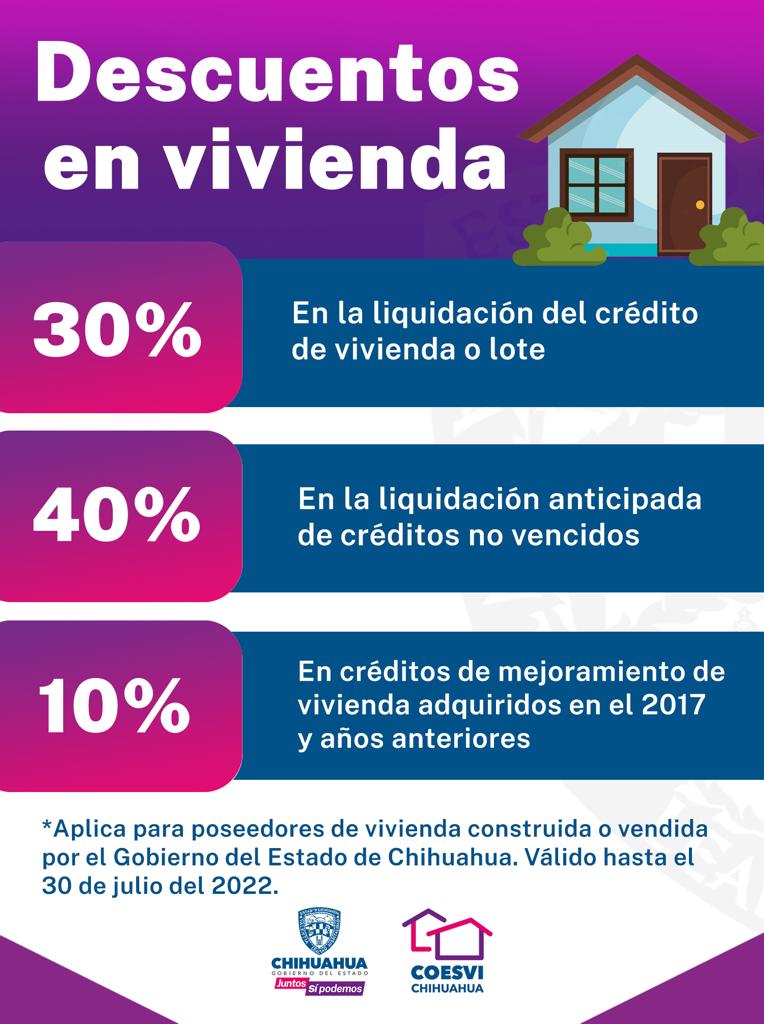 Como parte de las acciones que realiza Gobierno del Estado para apoyar a las familias de Ciudad Juárez que cuentan con créditos de vivienda o lote, a cargo de la Comisión Estatal de Vivienda, Suelo e Infraestructura (COESVI), inició un programa de descuentos que contribuirán a la economía familiar.