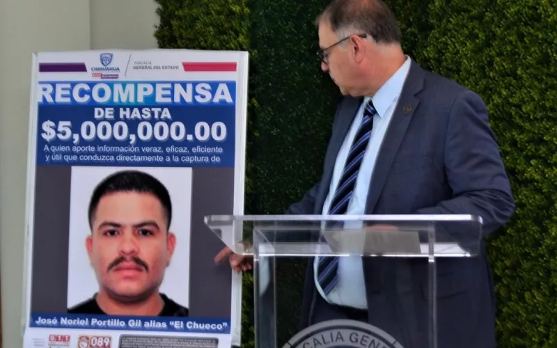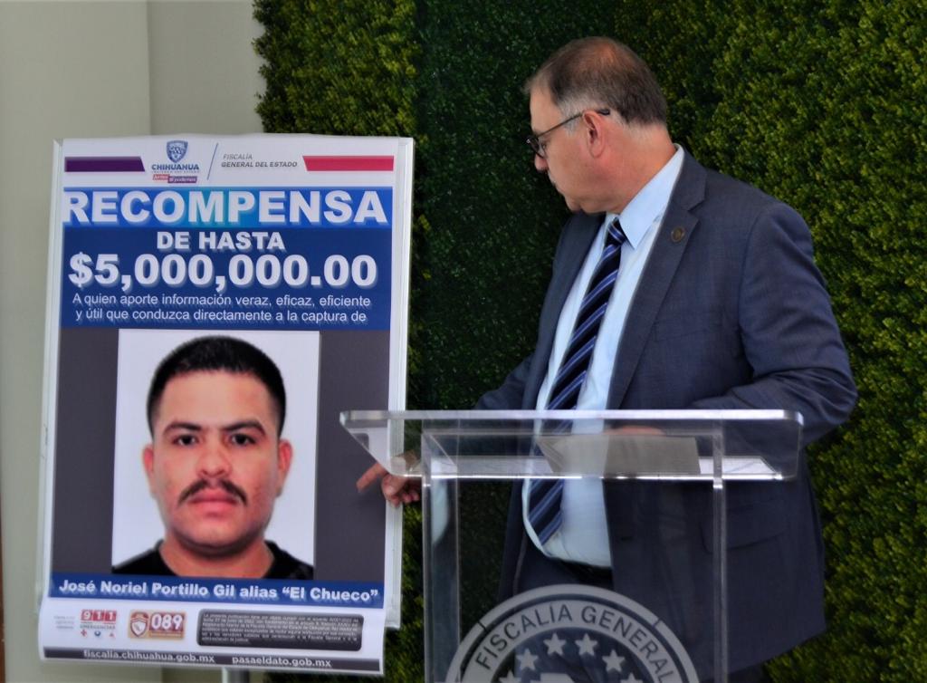 La Fiscalía General del Estado de Chihuahua ofrece una recompensa de hasta 5 millones de pesos a quien o quienes aporten información veraz, eficaz, eficiente y útil que conduzca directamente a la captura de José Noriel Portillo Gil alias “El Chueco”.