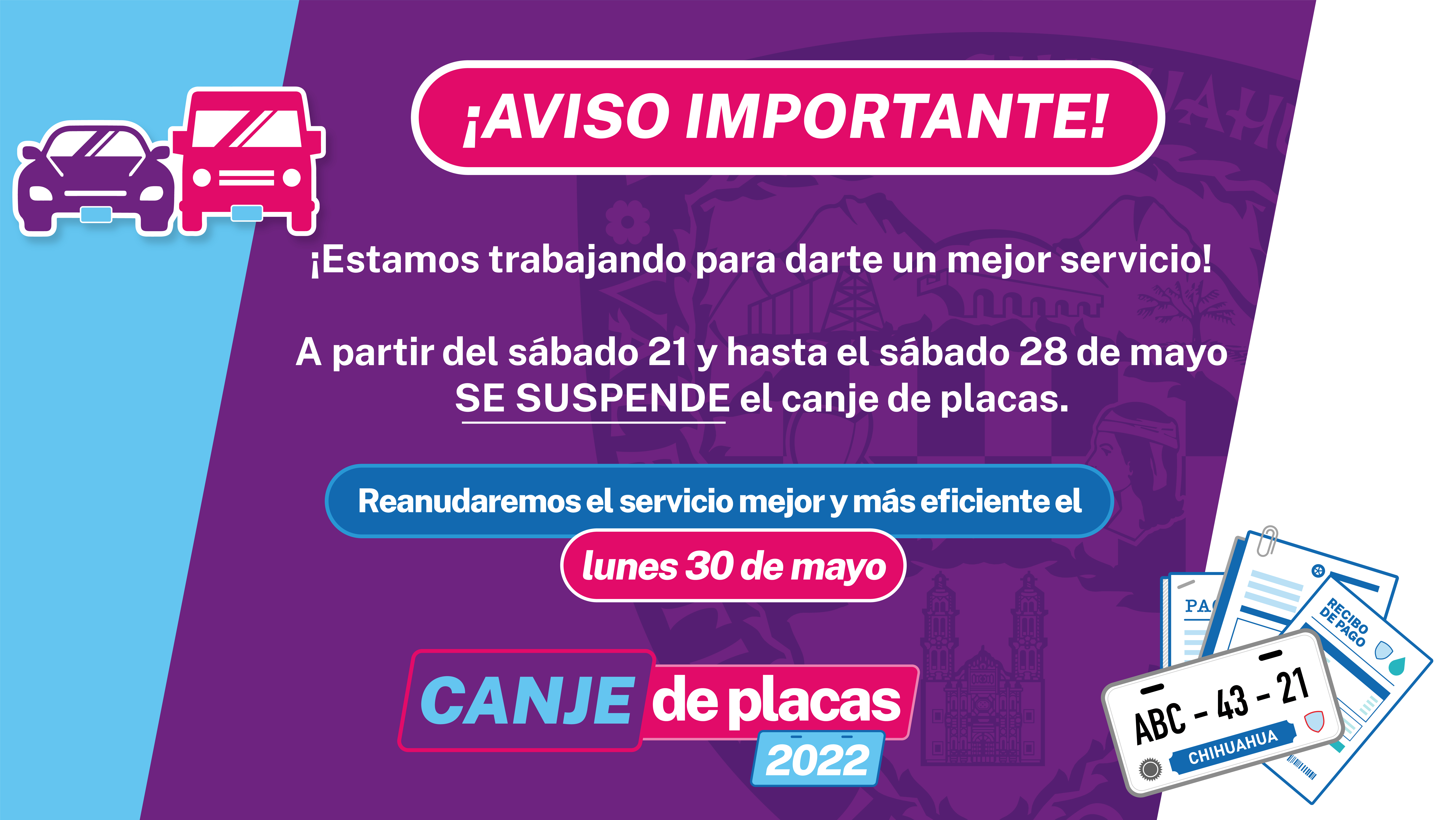 El Gobierno del Estado por conducto de la Secretaría de Hacienda, anuncia que debido a la implementación de mejoras en la logística y mantenimiento de los sistemas informáticos a partir de mañana y durante toda la próxima semana, se suspende el trámite de canje de placas en todas las oficinas de la entidad.