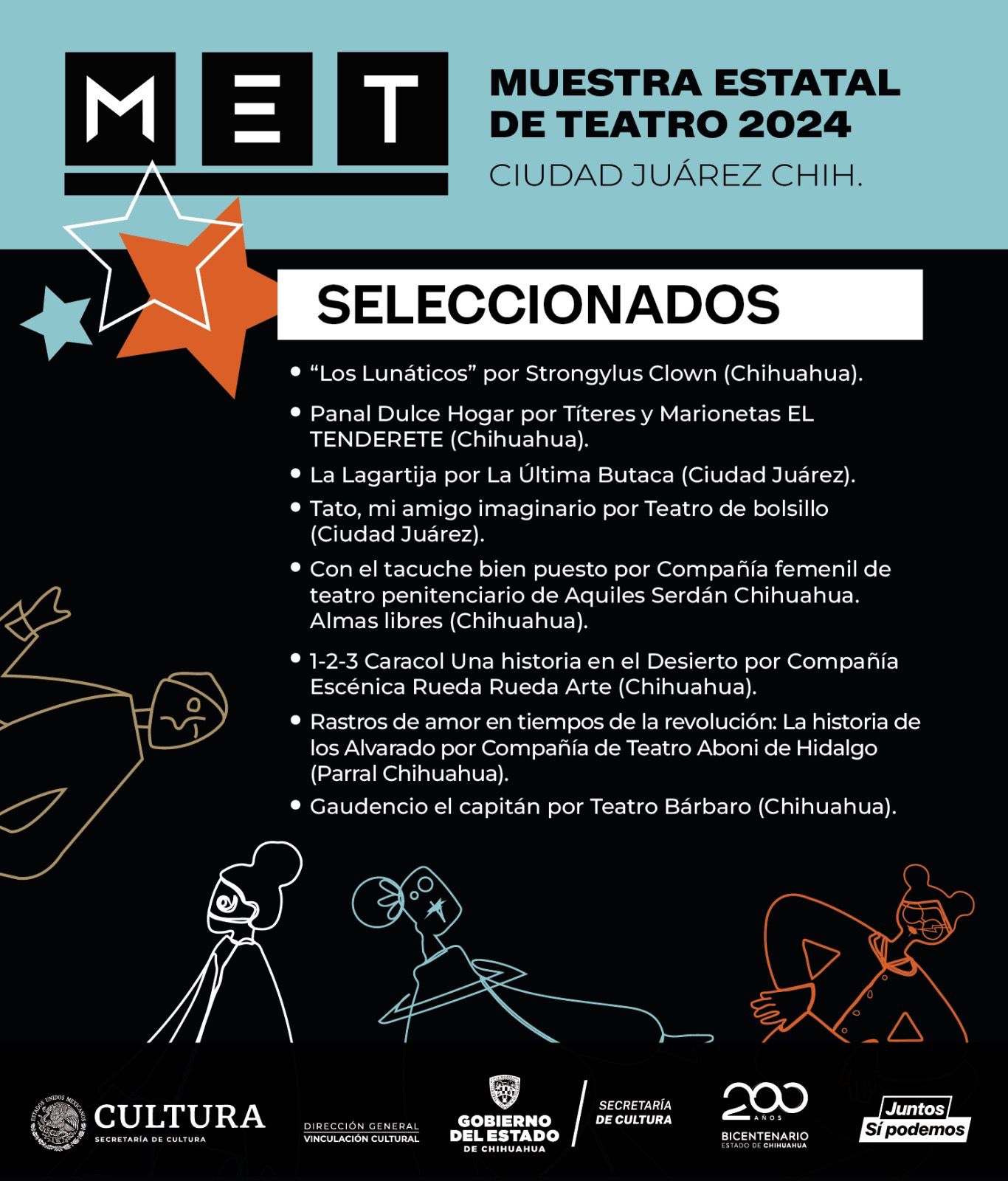 De Ciudad Juárez, los grupos seleccionados fueron: “La lagartija” por La Última Butaca; y “Tato, mi amigo imaginario” por Teatro de Bolsillo; de Parral, la compañía ganadora fue Teatro Aboni con la obra “Rastros de amor en tiempos de la revolución: La historia de los Alvarado”.