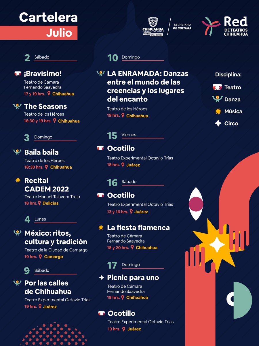El Gobierno del Estado de Chihuahua, a través de la Secretaría de Cultura, invita a conocer la cartelera del Programa Red de Teatro 2022, conformada por funciones de danza, teatro y música, que se presentarán durante julio en municipios como, Chihuahua, Ciudad Juárez, Delicias y Camargo.