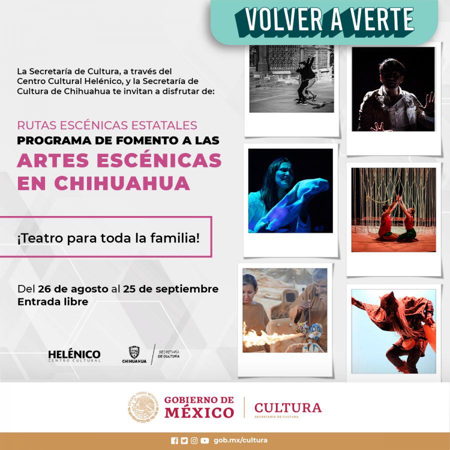 La Secretaría de Cultura anunció que del 26 de agosto al 25 de septiembre, 6 compañías teatrales presentarán de manera gratuita sus puestas en escena, en los municipios de Delicias, Meoqui, Saucillo, Ascensión, Casas Grandes, Buenaventura, Camargo, Jiménez, Parral, San Francisco del Oro, Santa Bárbara, Guachochi, Riva Palacio, Cuauhtémoc, Guerrero, Santa Isabel, Aldama y Satevó.