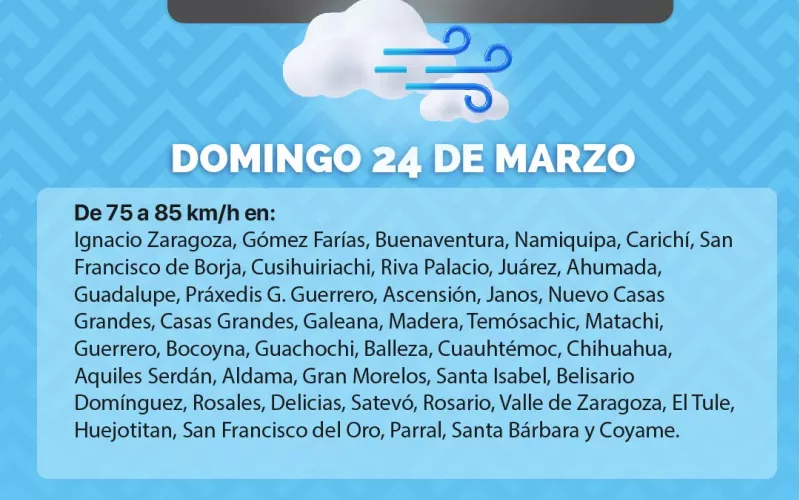 Se prevé que, en el transcurso de la tarde sábado 23 y domingo 25 de marzo, las rachas de viento se intensifiquen en gran parte del estado.