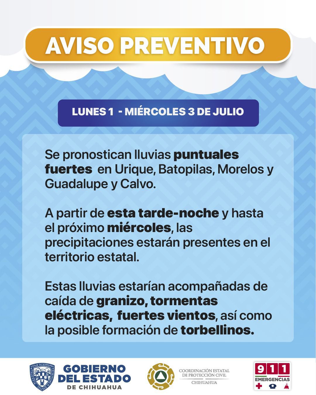 La Coordinación Estatal de Protección Civil (CEPC) informa que prevalece el pronóstico lluvias puntualmente fuertes, de 25.1 a 50 milímetros de acumulación (mm) en Urique, Batopilas, Morelos, y Guadalupe y Calvo, en el transcurso de esta tarde-noche.