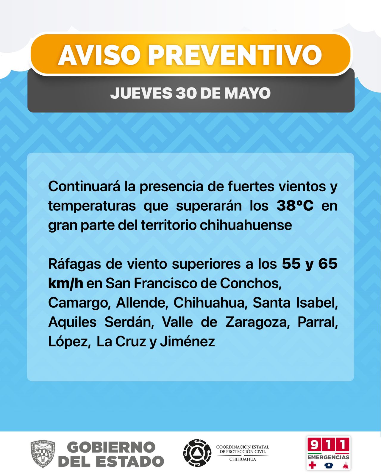 La Coordinación Estatal de Protección Civil (CEPC) dio a conocer que para este jueves 30 de mayo continuará la presencia de fuertes vientos, así como del registro de altas temperaturas que superarán los 38 grados en gran parte del territorio chihuahuense.