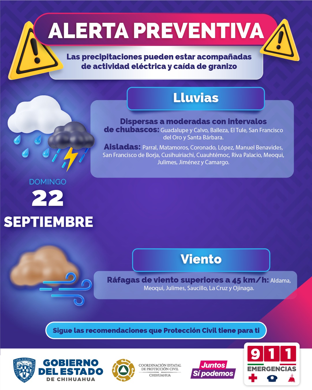 Se prevén lluvias dispersas a moderadas con chubascos en Guadalupe y Calvo, Balleza, El Tule, San Francisco del Oro y Santa Bárbara; y aisladas a dispersas sobre Parral, Matamoros, Coronado, López, Manuel Benavides, San Francisco de Borja, Cusihuiriachi, Cuauhtémoc, Riva Palacio, Meoqui, Julimes, Jiménez y Camargo.