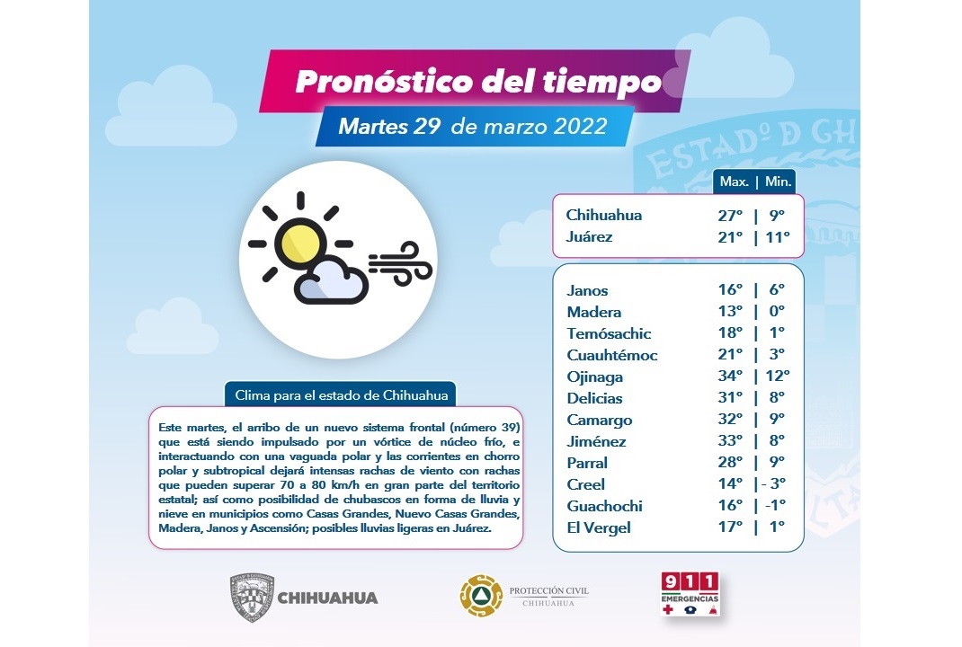 Te compartimos el pronóstico del clima para hoy martes 29 de marzo, en donde se esperan rachas de viento superiores a los 70 km/h en gran parte de la entidad, y en lugares como Majalca pueden superar los 115 km/h, Juarez y Chihuahua los 85 km/h.