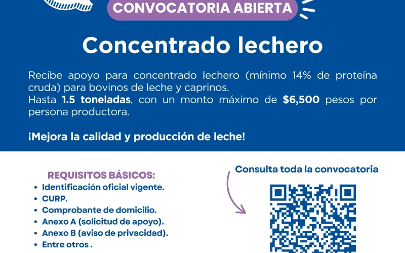 La Secretaría de Desarrollo Rural (SDR) publicó la convocatoria para el apoyo de concentrado lechero, dirigido a personas productoras de bovinos de leche y caprinos en la entidad.
