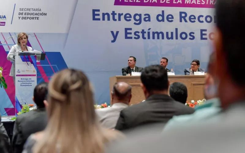 “Me da mucho gusto acompañarles en este día que conmemoramos su trabajo y pasión por la enseñanza”; “siendo sinceros, todos llevamos en el corazón a esa maestra o maestro que nos definió como personas. Todos atesoramos el recuerdo de aquel consejo que definió el rumbo de nuestro caminar”, indicó Maru Campos durante la ceremonia.