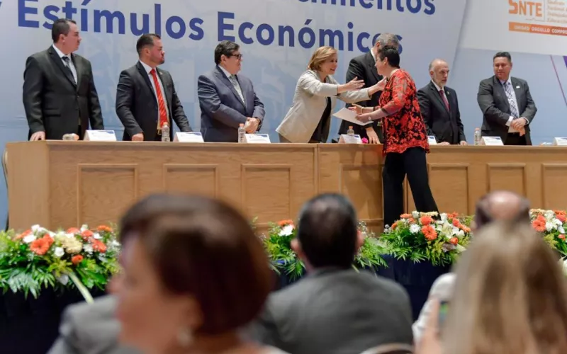 Durante esta ceremonia recibieron de manera simbólica estos beneficios, maestras, maestros y personal directivo de las regiones Centro-Sur, Centro, Paquimé, Sur, Serrana. Noroeste y Norte.