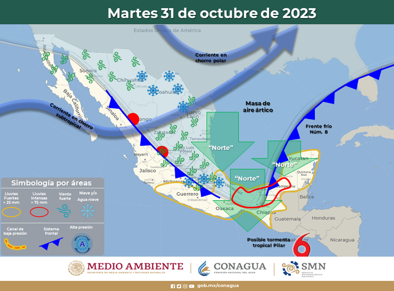 La CEPC informó además que se prevén lluvias aisladas de 0.1 a 2 mm en la zona sureste, mismas pueden estar acompañadas de actividad eléctrica y/o caída de granizo.